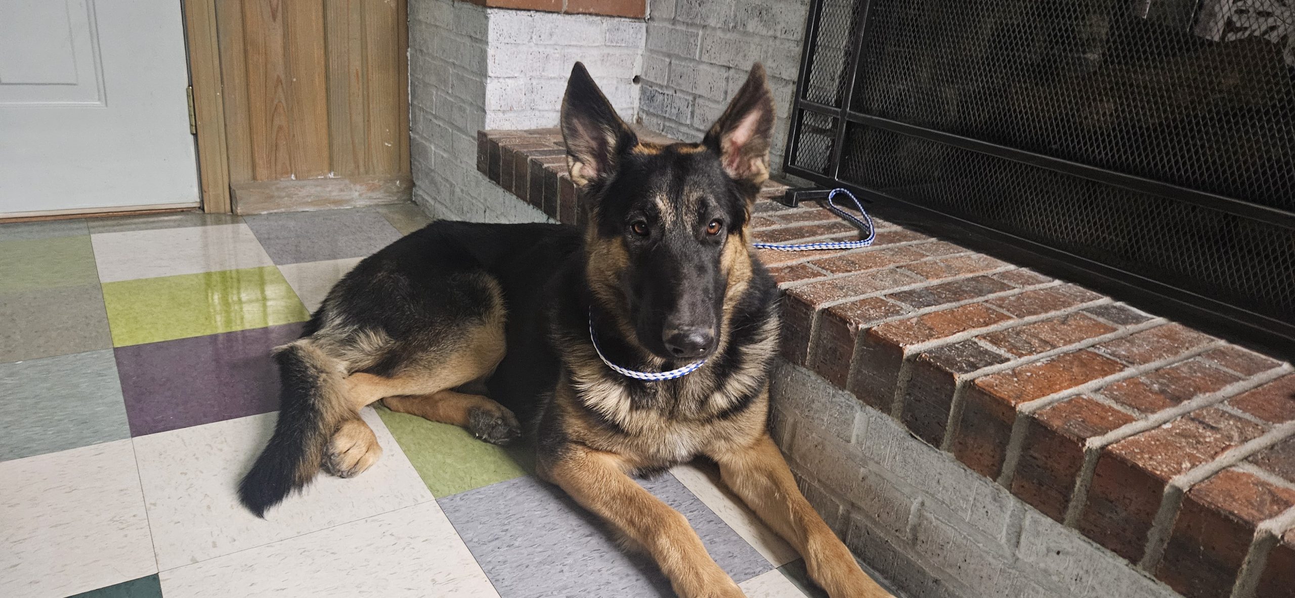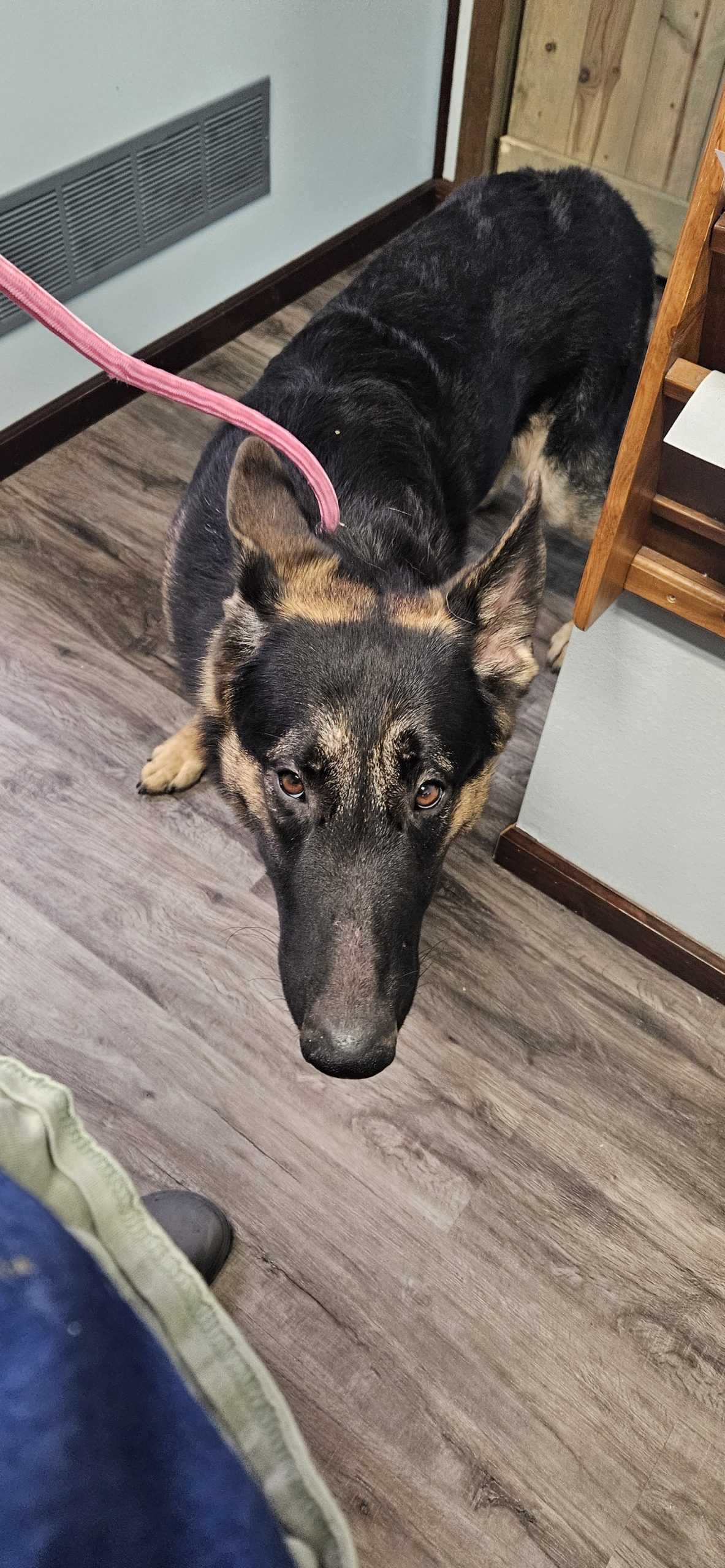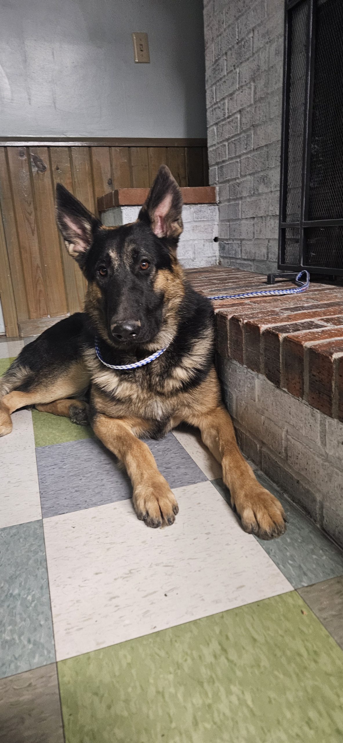 Chunk had to be given up after his owner's home caught fire. He lived with an elderly man and several other shepards. His mother was 1/2 german Shepard and 1/2 Malinois. His father was full shepard. While he was loved in the first year of his life he had not been socialized much. Chunk is very submissive with people and other dogs. He does enjoy the companionship of other dogs though and has had no problems getting along with puppies, small dogs or other males. We were also told that he had been fine around cats in his previous home. Chunk is very eager to please but will require some patience while he learns to trust new people. He is crate trained and housetrained.