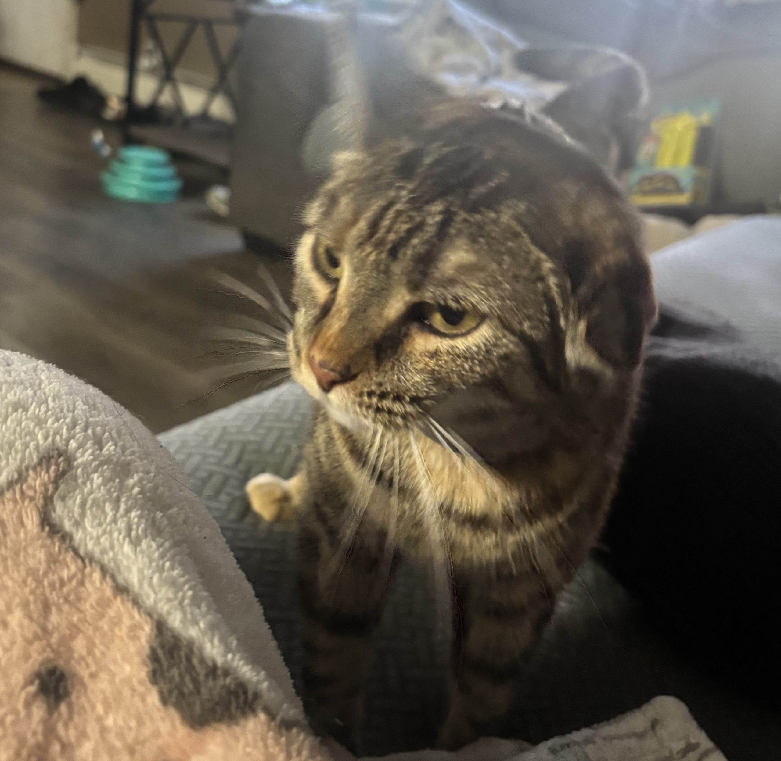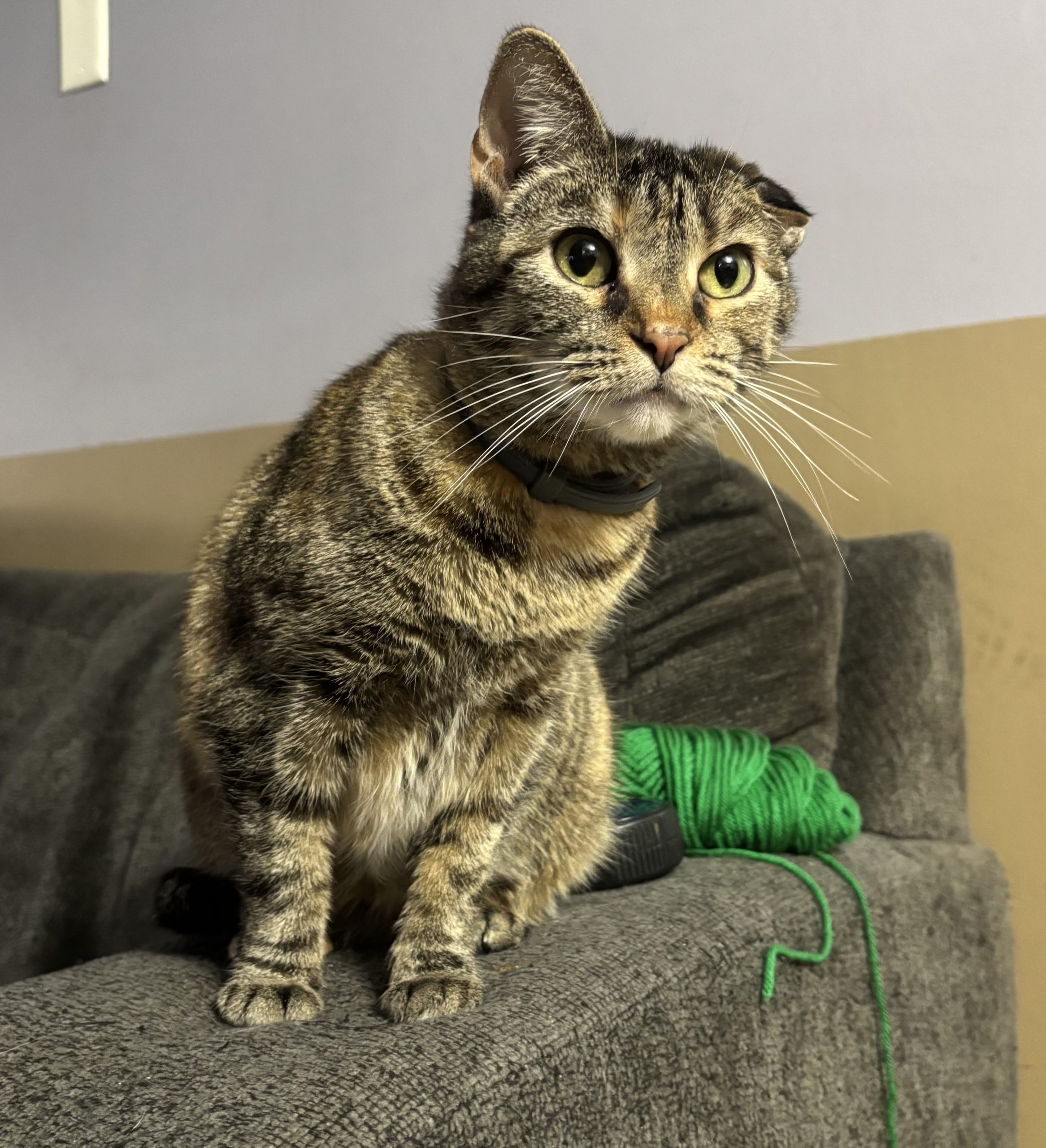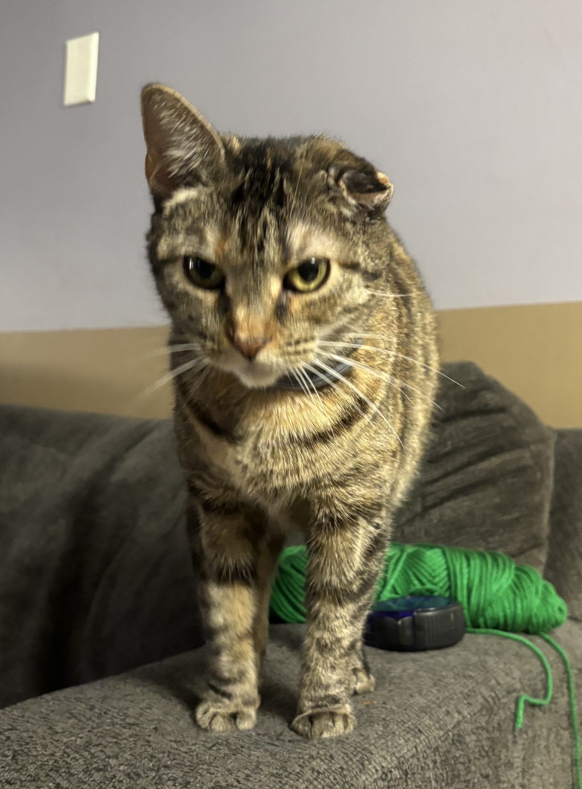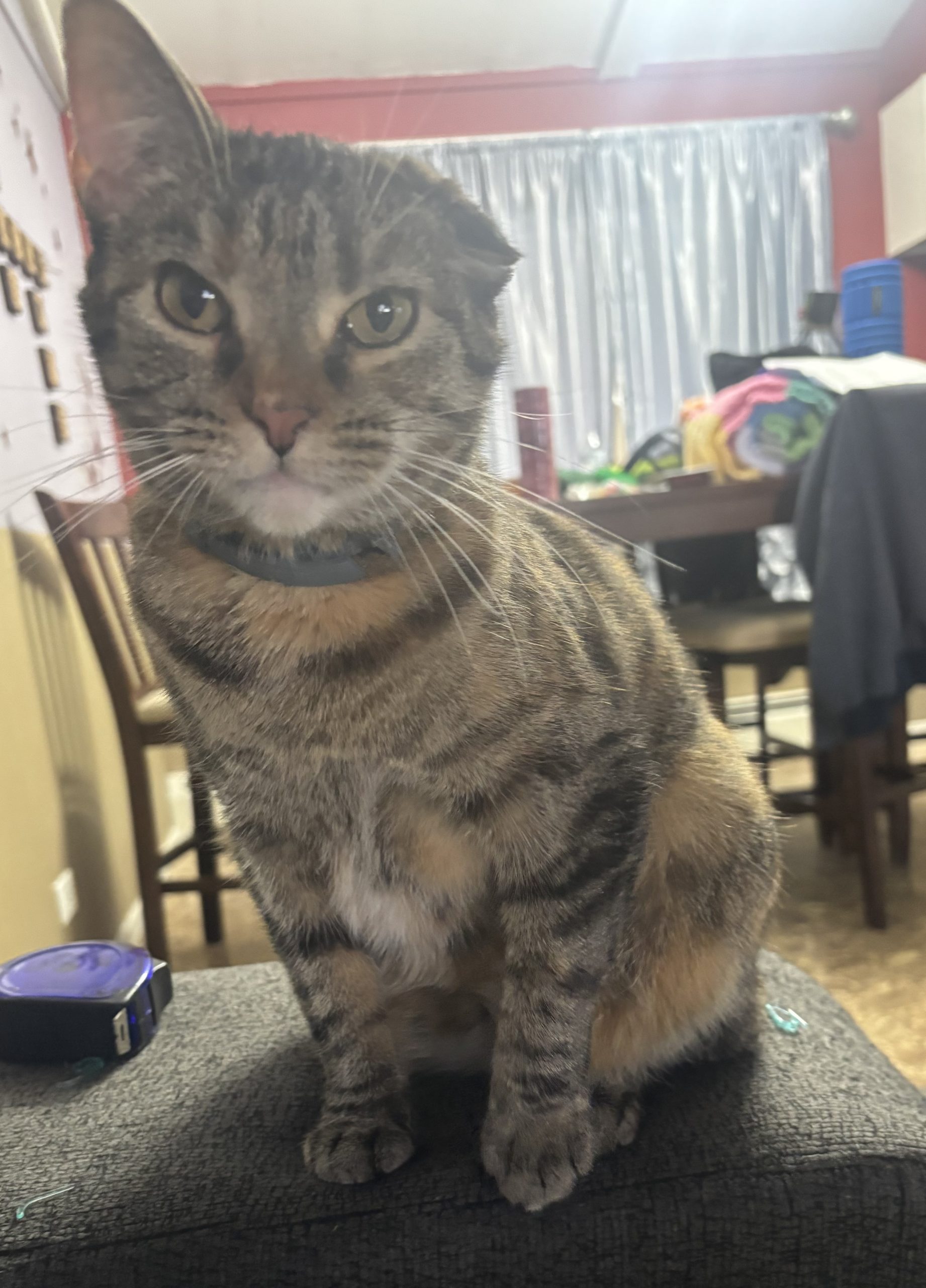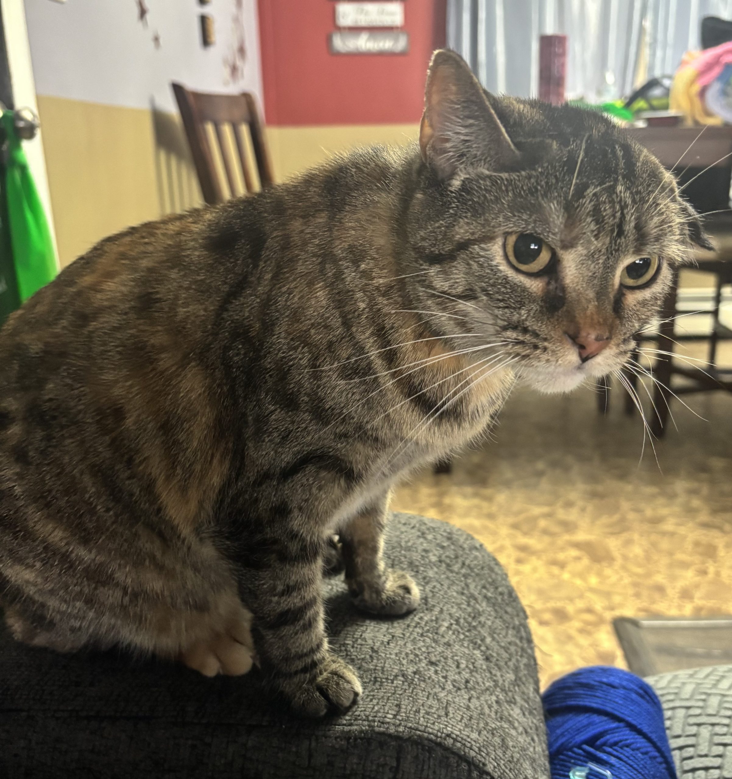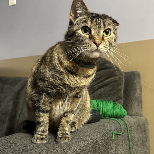 Glitter came to us when her owner passed way and a neighbor took on the 7 indoor cats and were helping find them homes. Glitter is very sweet and affectionate and loves to play. She does have a cauliflower ear, that’s why it looks like one of her ears is smooshed down. At some point she must have injured the cartilage and that’s how it healed. She’ll make a good pet for anyone