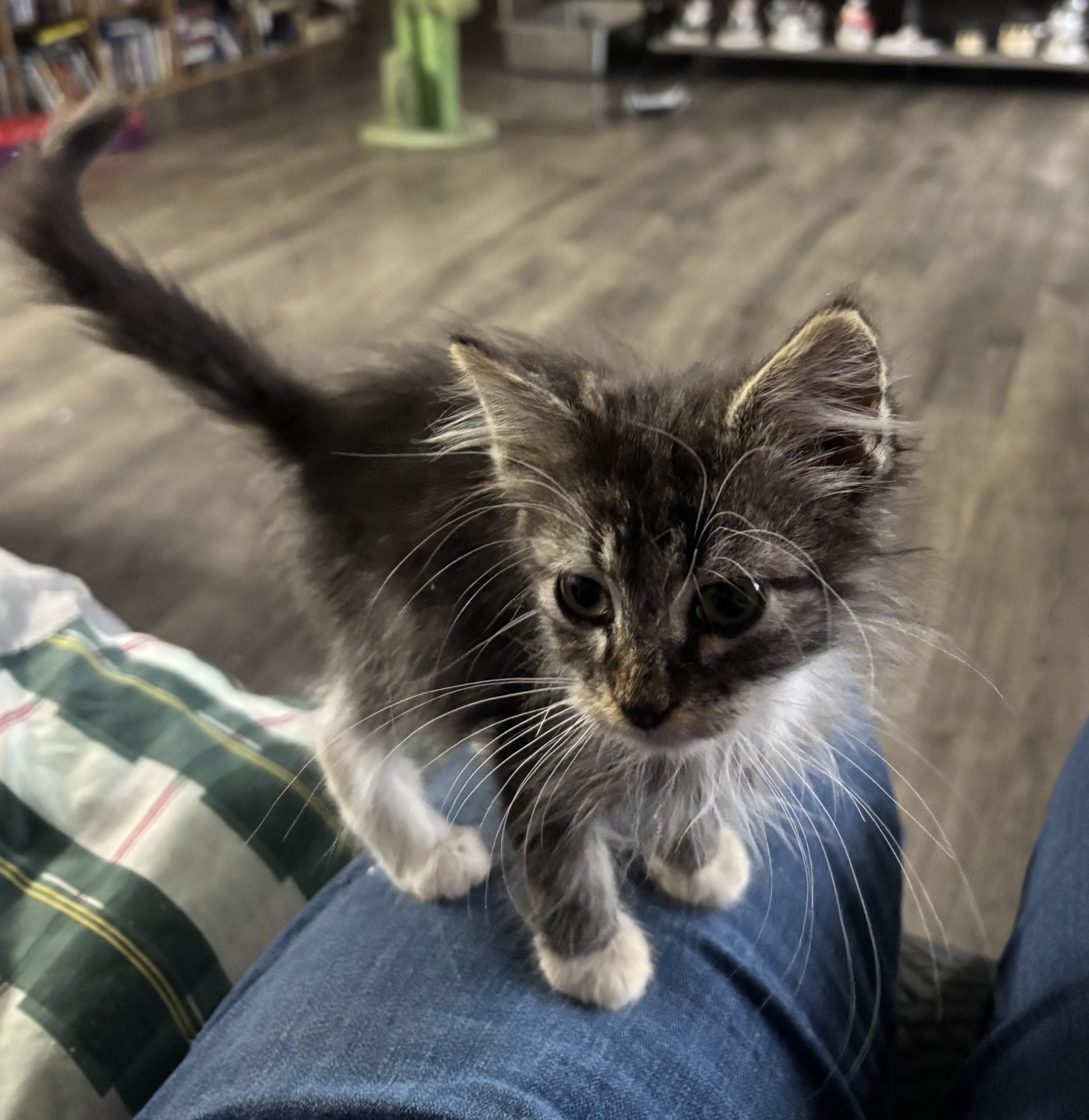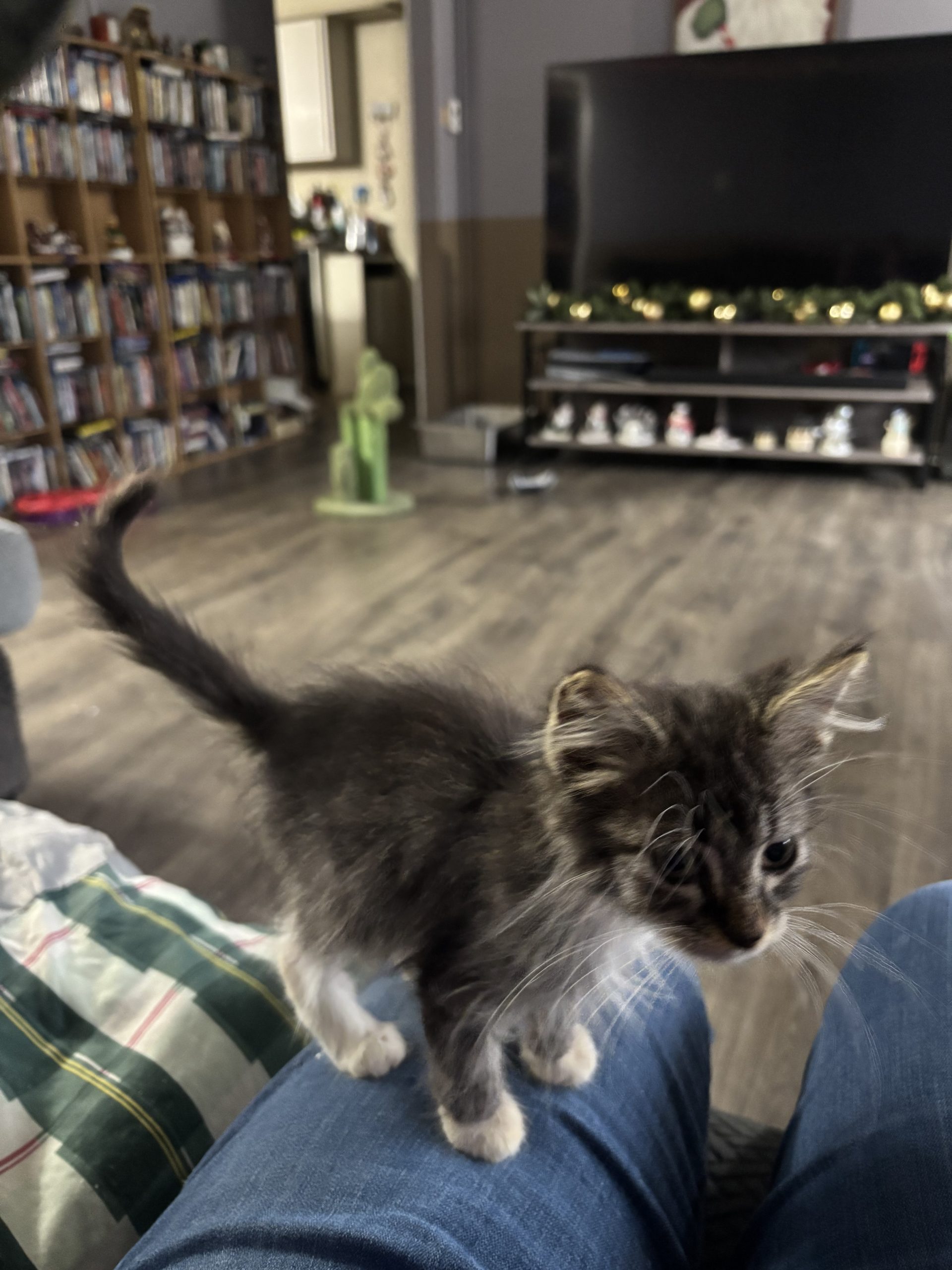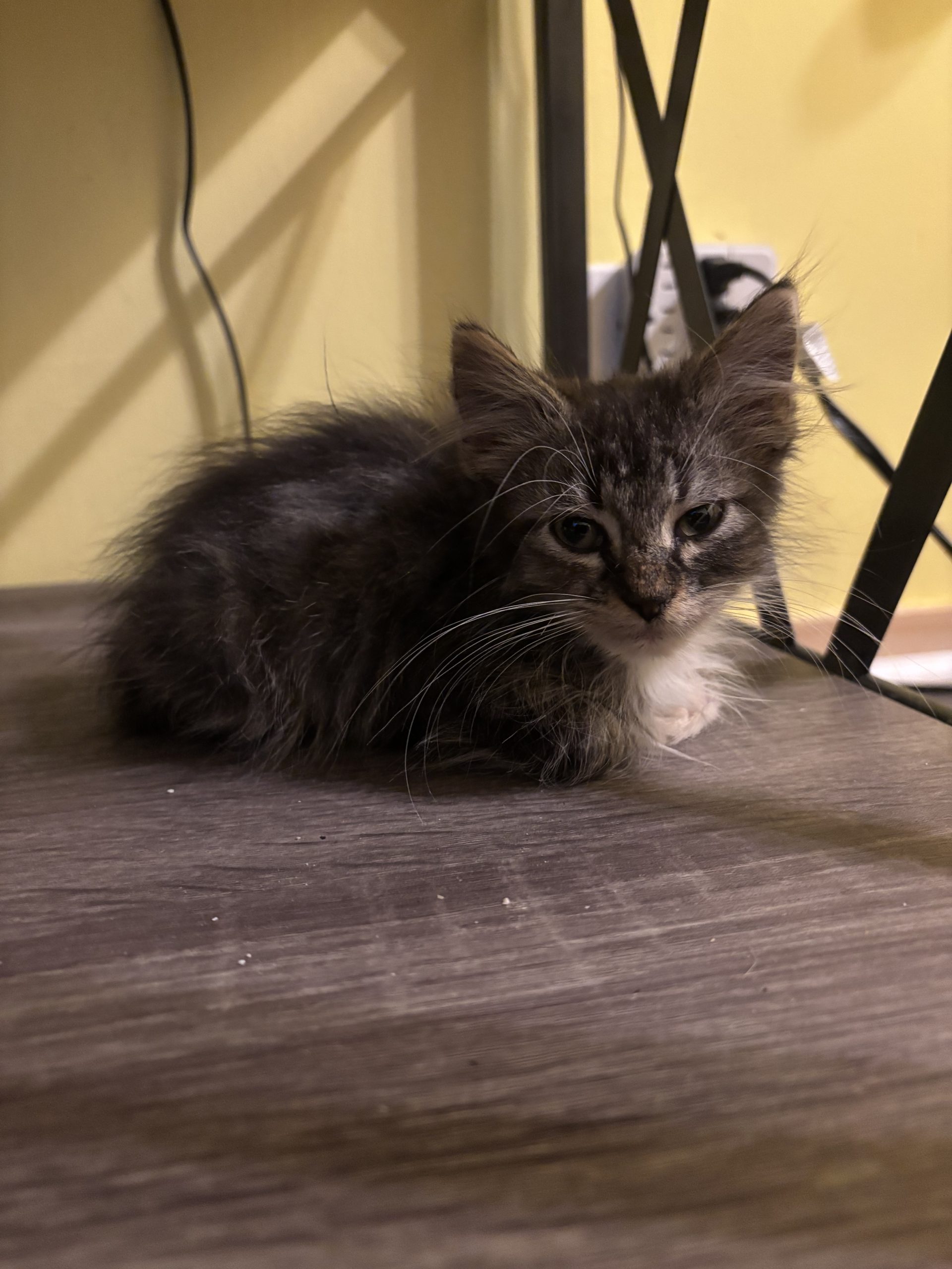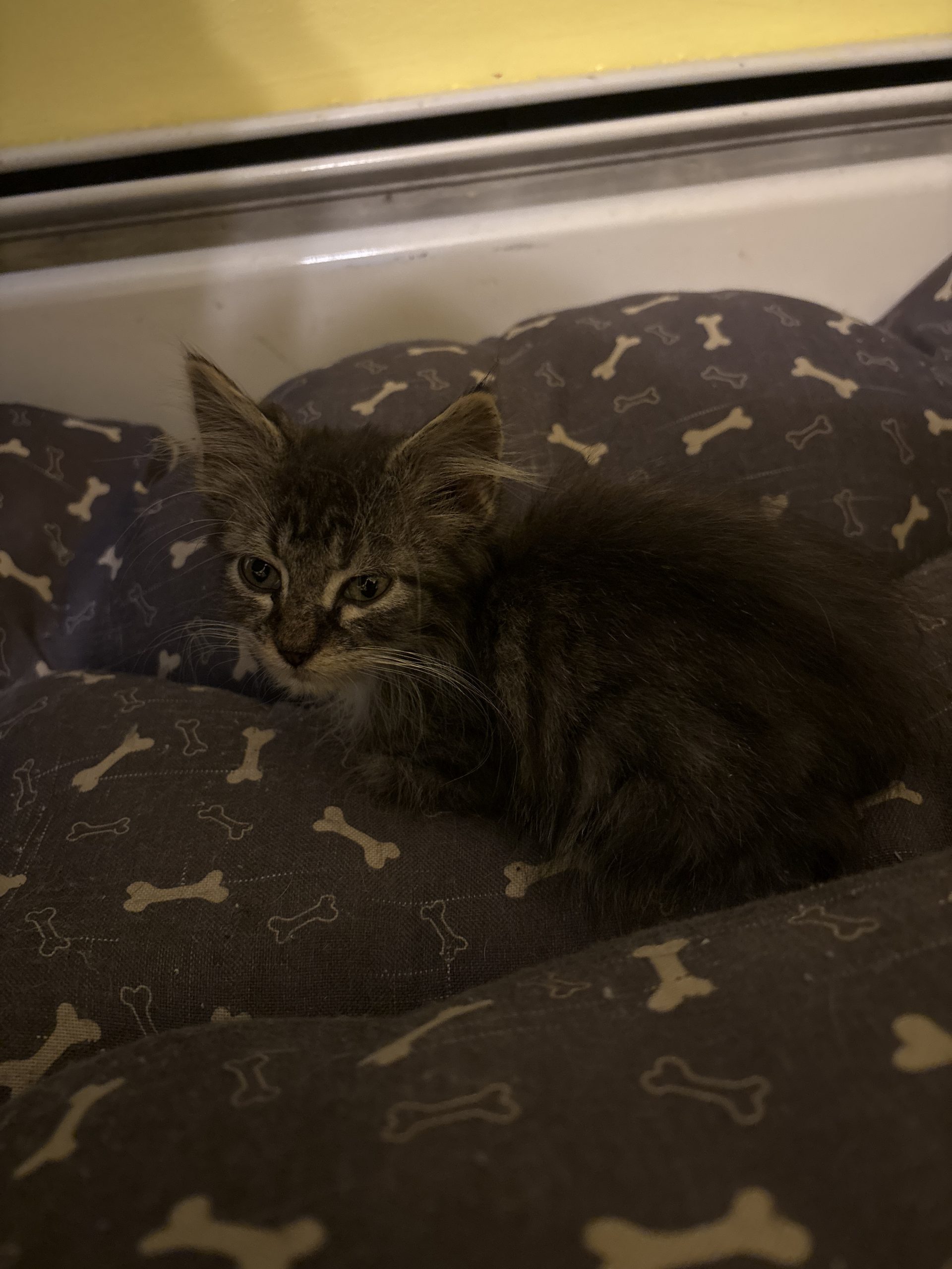 Izzy came to us with his brother but he was severely underweight, about half the size of his brother. He’s getting all the high calorie food he can handle to put some weight on him. He’s very social and playful, despite his small size he loves the cat toys we have and gets along great with the other foster cats in the house. Izzy is not neutered yet due to his small size and poor body condition. We will neuter him as soon as he’s healthy enough